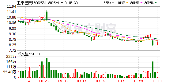 在这一消息披露后,卫宁健康股价急速下跌,于11月6日收跌10.38%。截至11月10日收盘,卫宁健康报8.29元/股,总市值为183.6亿元。